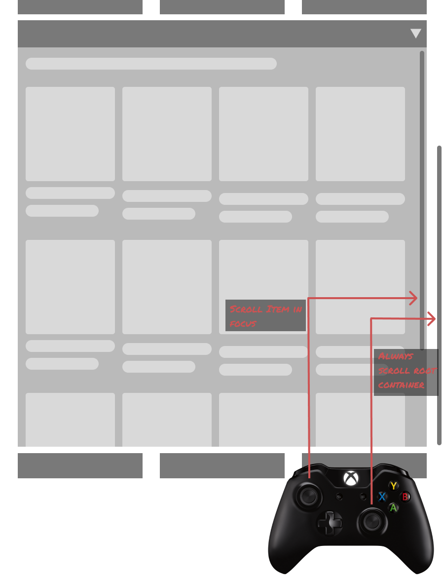 For example, the original prototypes included expanders with nested scrolls to hide secondary information. While this is a common design pattern for Desktop where users have a mouse and on mobile where users can touch, on consoles it created a major issue.